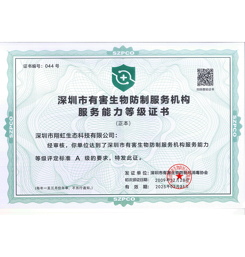 有害生物防制服務(wù)機(jī)構(gòu)服務(wù)能力證書(shū)A級(jí)